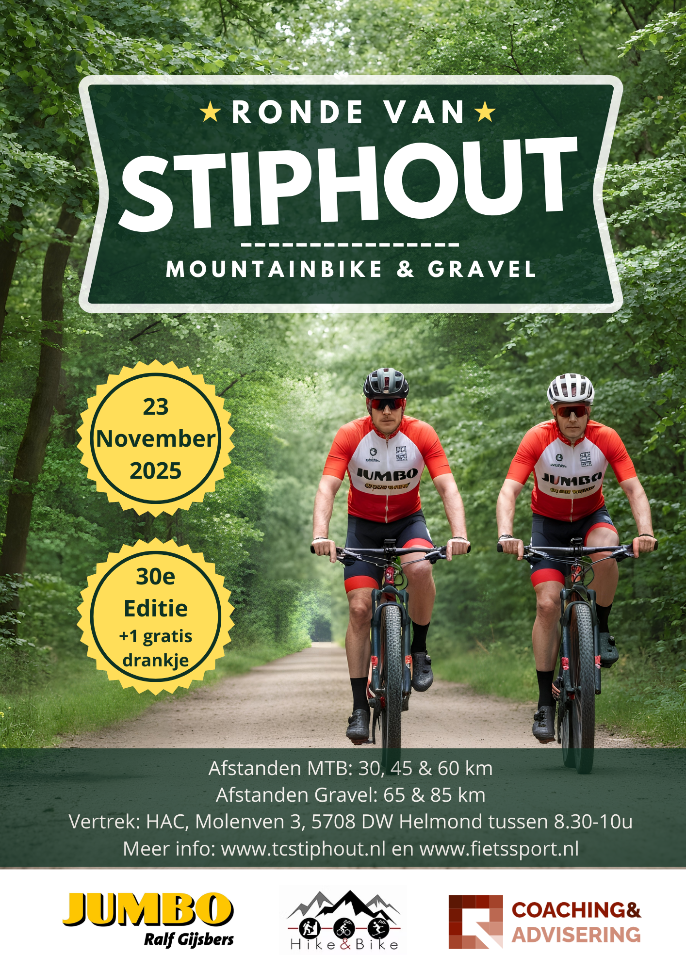 Op 23 november 2025 organiseren we de 30e jubileumeditie van de Ronde van Stiphout! Dit jaar beloven we wat extra’s om deze mijlpaal te vieren. En natuurlijk kun je ook genieten van de mooie routes én de Brabantse gezelligheid die je van ons gewend bent.